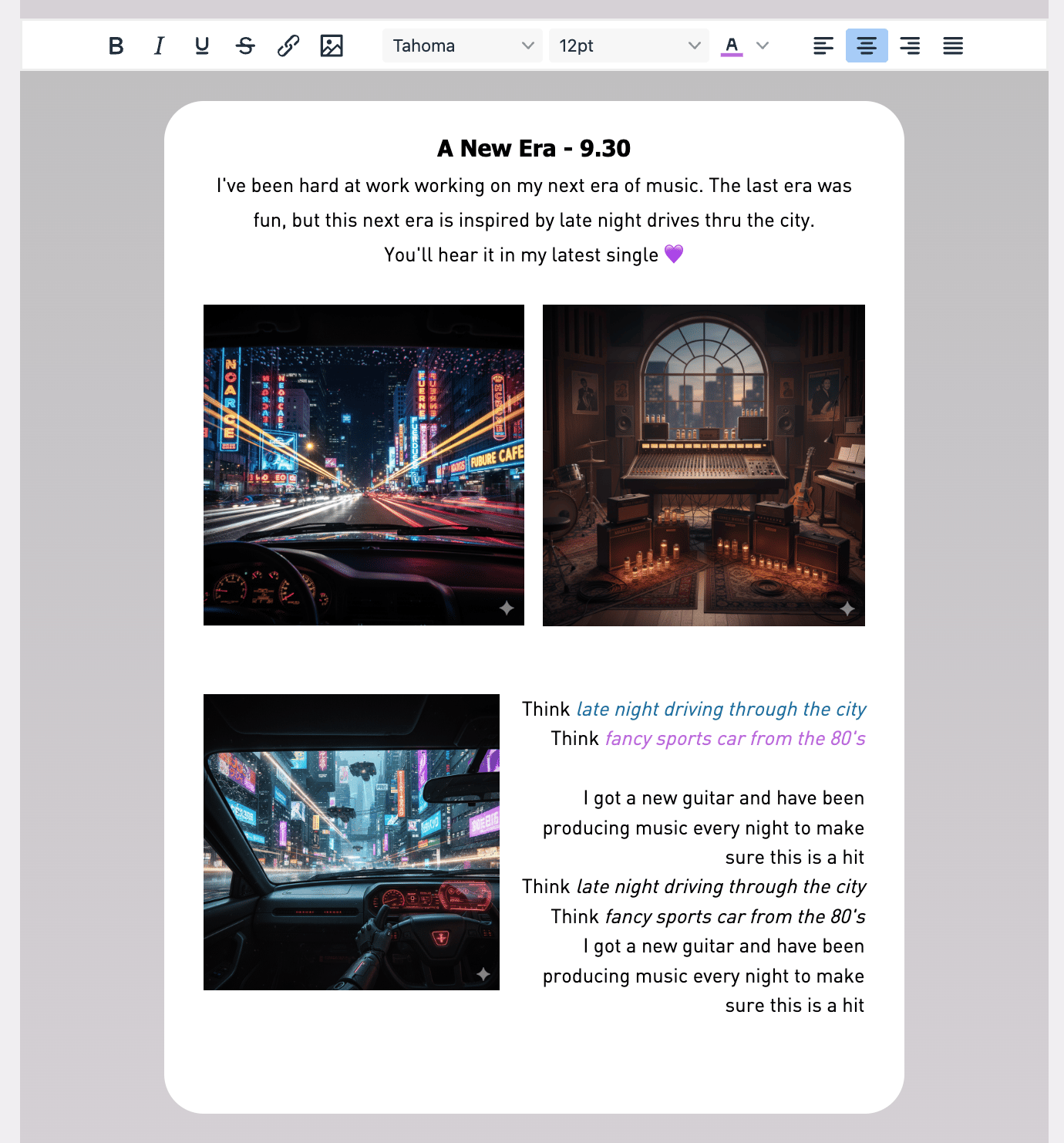 Custom Editor: Bold, italic, links, inline images — all the basics, fluid and simple.