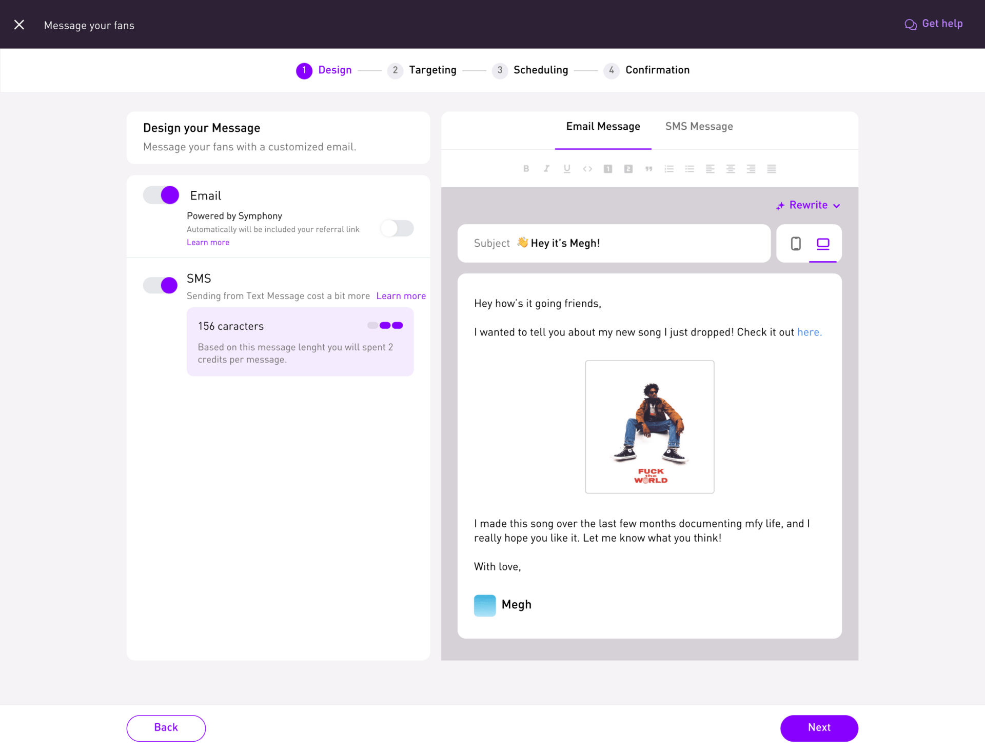 Because the moment artists could hit “send” without leaving Symphony, the whole loop clicked into place. Ads didn’t just get streams — they grew fan lists. Pages didn’t just collect names — they became direct-to-fan conversations. Momentum didn’t leak out between tools. It built it.