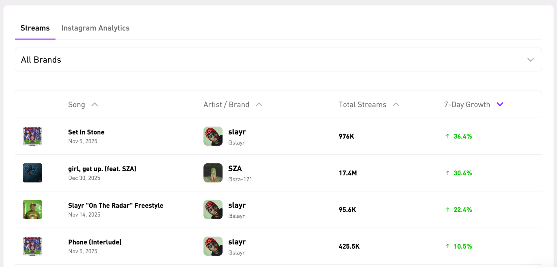 Growth graphs for ALL your brands at once: No more switching between accounts. See your entire roster's performance side-by-side.