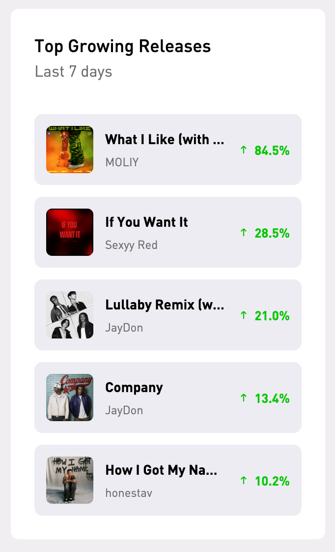 Top growing songs on the right-hand side: Quick wins, front and center. Know what's rapidly growing without digging.